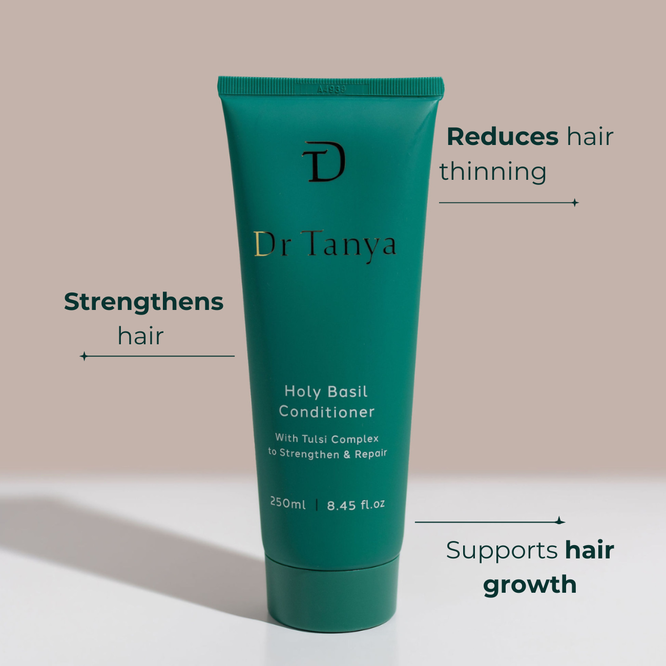 Our Holy Basil Conditioner nourishes and fortifies hair strands, provides a calming effect on the scalp, and leaves hair silky soft.