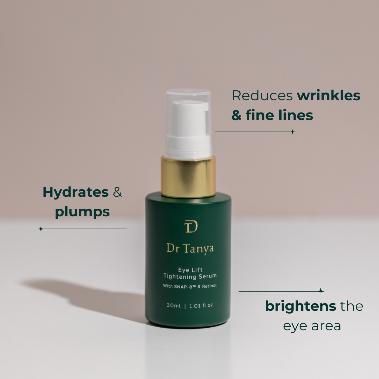 Dr Tanya's results-driven Eye Lift Tightening Serum is the holy grail of anti-aging formulas for treating deep wrinkles and the appearance of dark, tired-looking eyes.